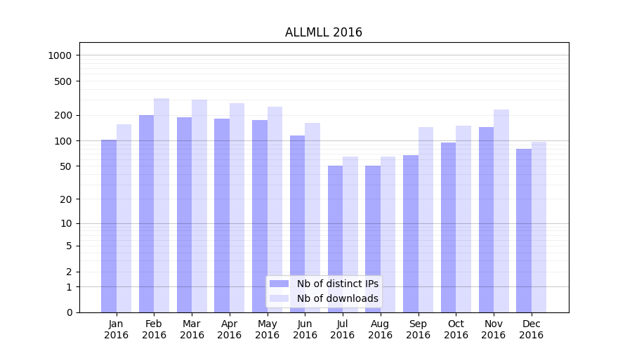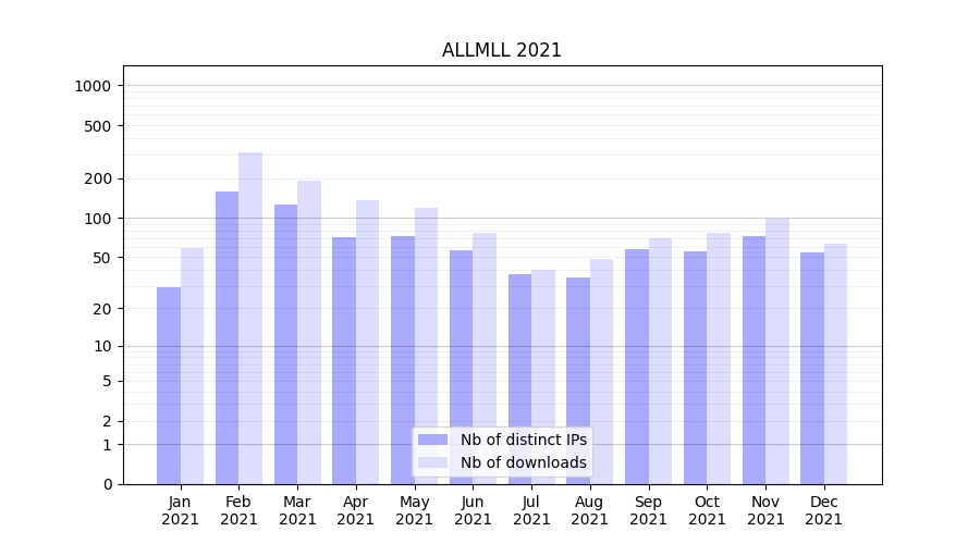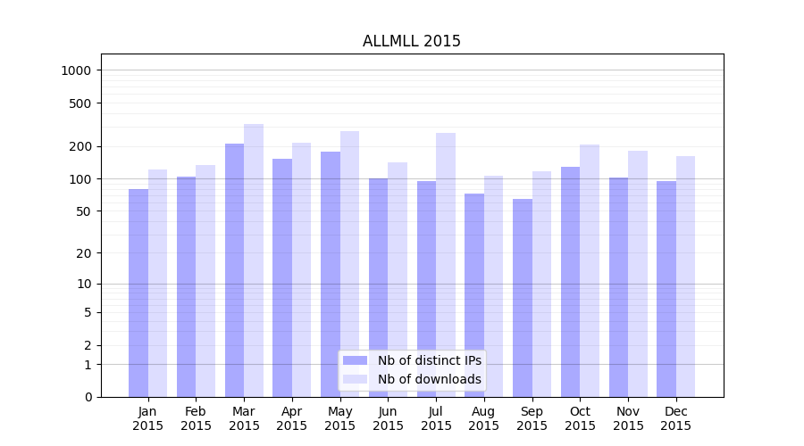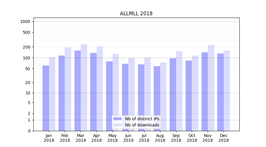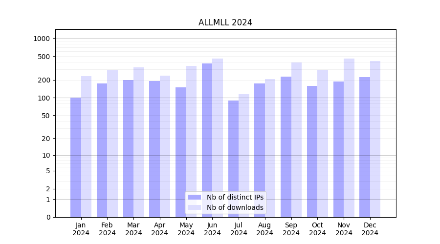 Number of downloads for experiment package ALLMLL, year by year, from 2025 back to 2014 (years with no downloads are omitted):