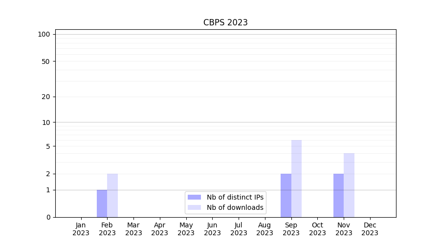 Number of downloads for experiment package CBPS, year by year, from 2025 back to 2014 (years with no downloads are omitted):