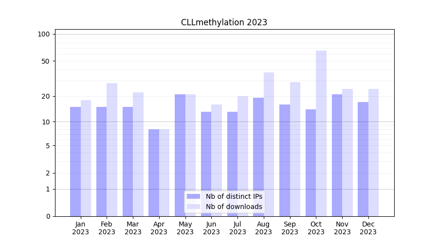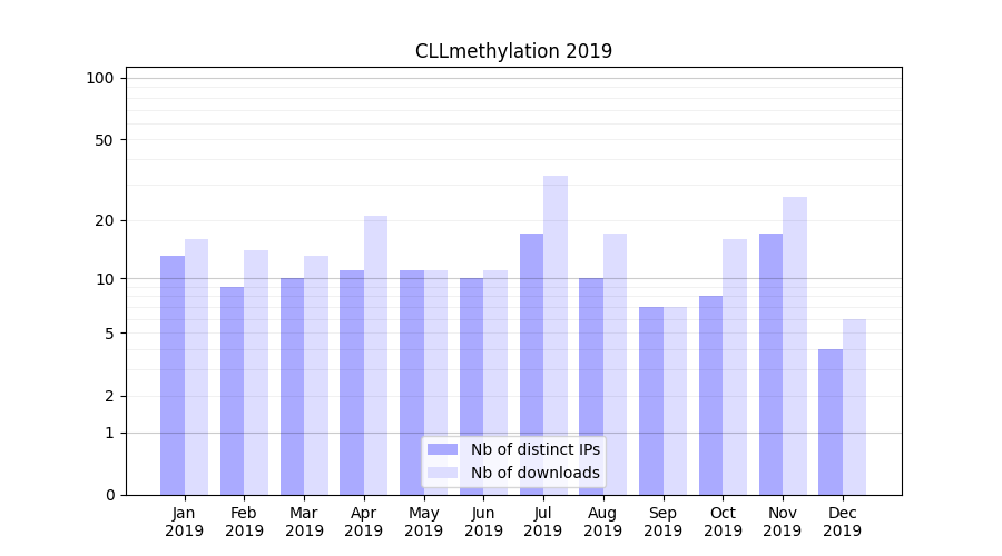 Number of downloads for experiment package CLLmethylation, year by year, from 2025 back to 2014 (years with no downloads are omitted):