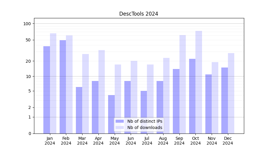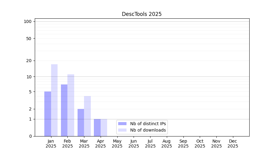 Number of downloads for experiment package DescTools, year by year, from 2025 back to 2014 (years with no downloads are omitted):