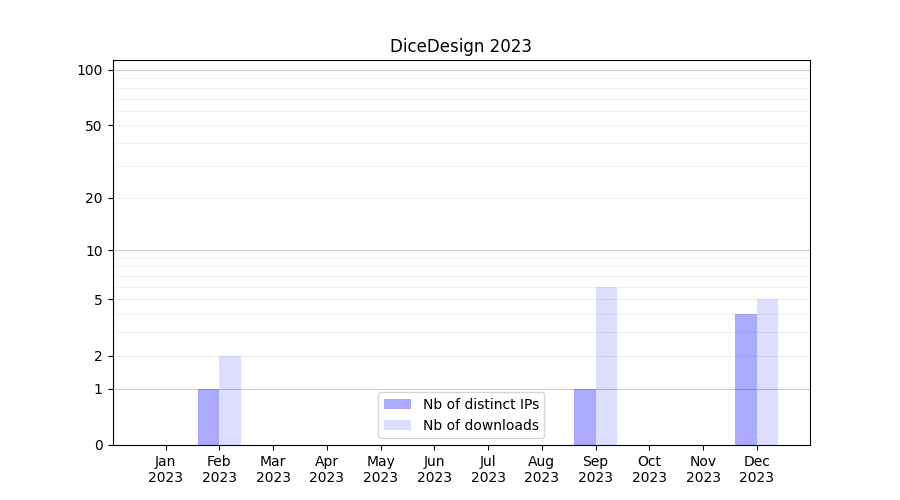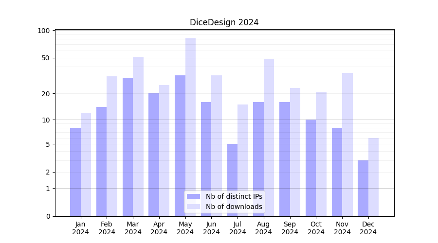 Number of downloads for experiment package DiceDesign, year by year, from 2025 back to 2014 (years with no downloads are omitted):
