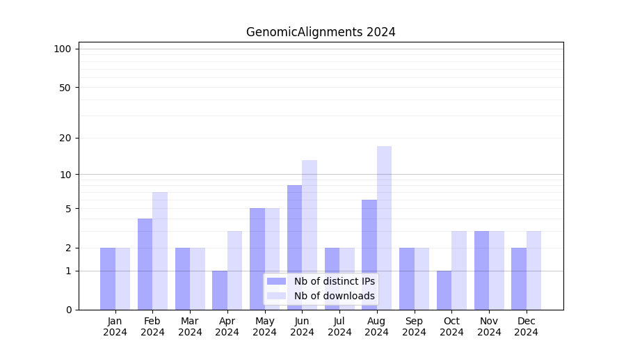 Number of downloads for experiment package GenomicAlignments, year by year, from 2025 back to 2014 (years with no downloads are omitted):