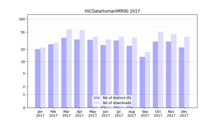 Number of downloads for experiment package HiCDataHumanIMR90, year by year, from 2025 back to 2014 (years with no downloads are omitted):