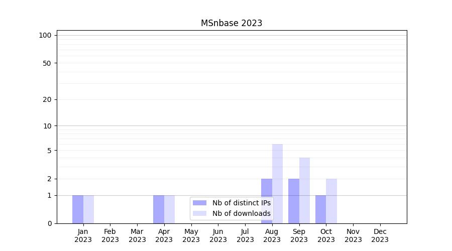 Number of downloads for experiment package MSnbase, year by year, from 2025 back to 2014 (years with no downloads are omitted):
