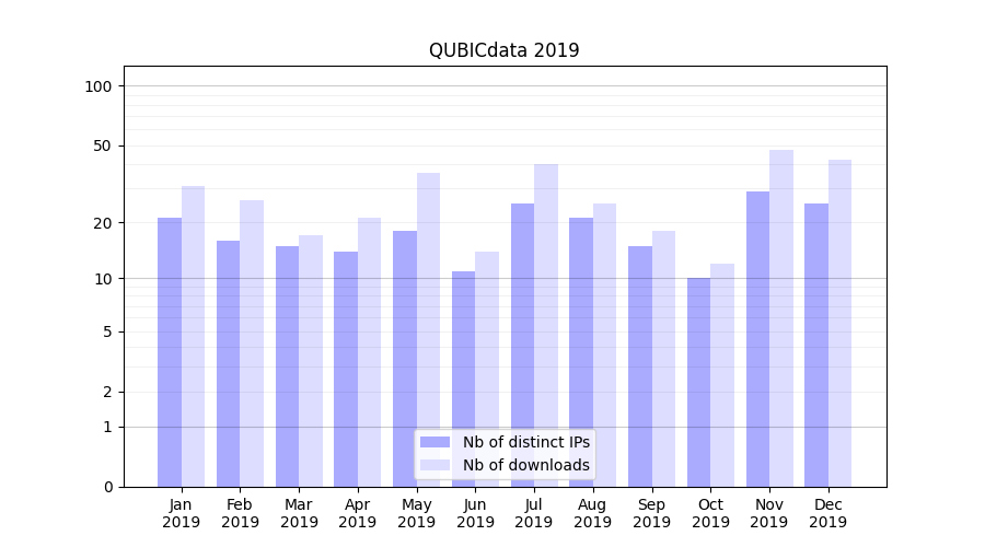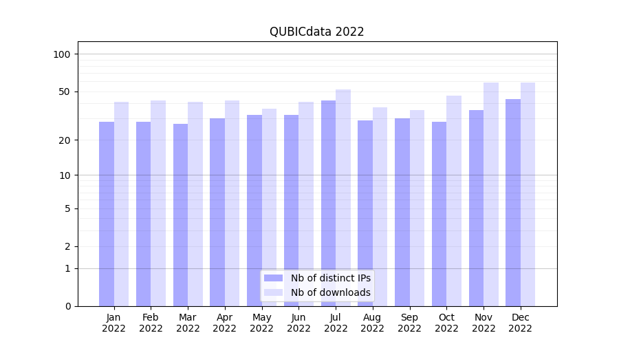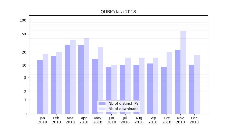 Number of downloads for experiment package QUBICdata, year by year, from 2025 back to 2014 (years with no downloads are omitted):