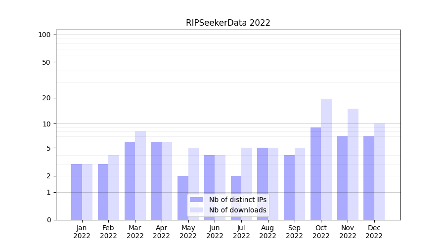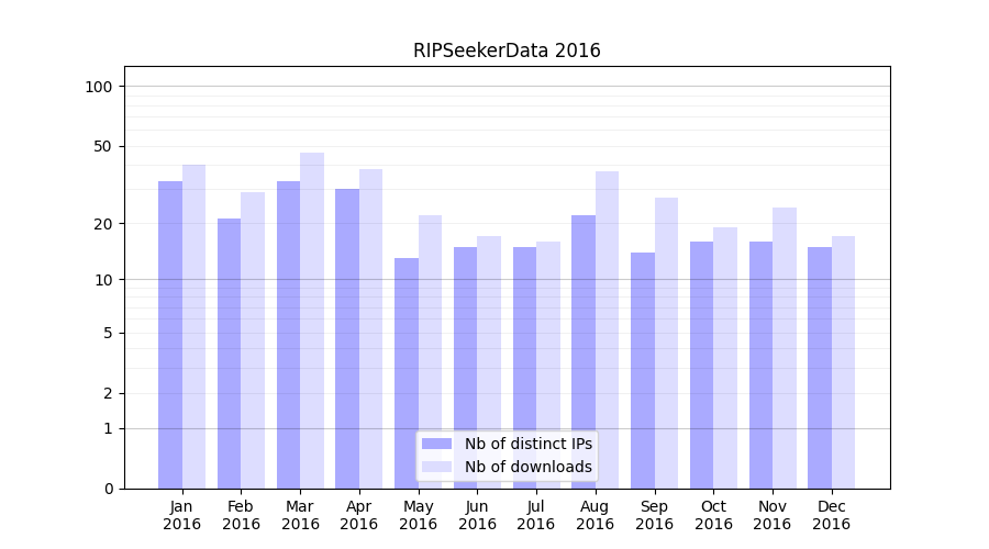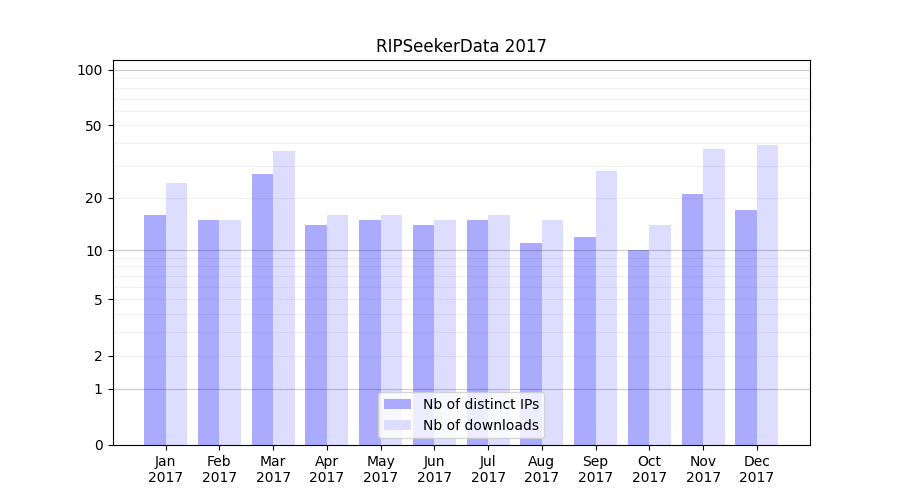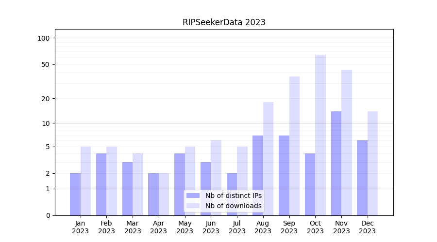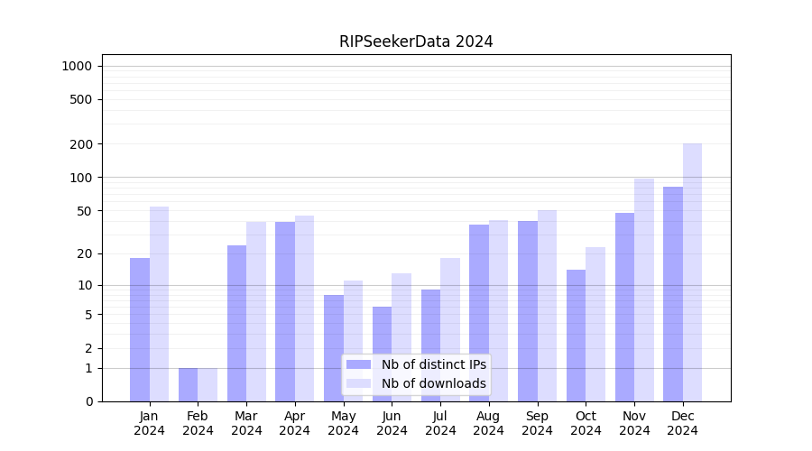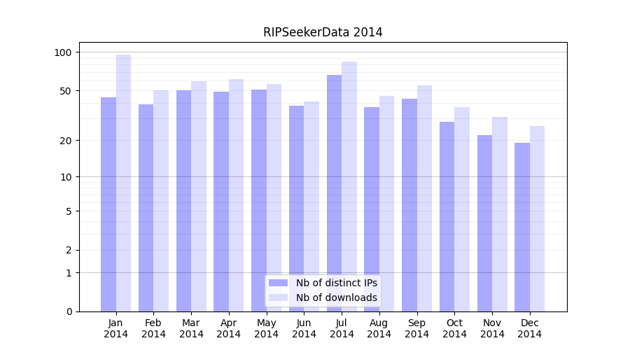 Number of downloads for experiment package RIPSeekerData, year by year, from 2025 back to 2014 (years with no downloads are omitted):