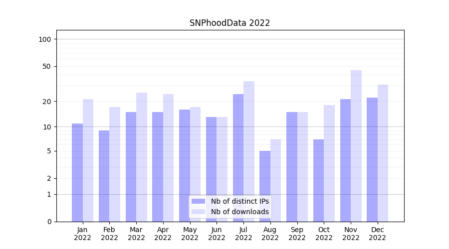 Number of downloads for experiment package SNPhoodData, year by year, from 2025 back to 2014 (years with no downloads are omitted):