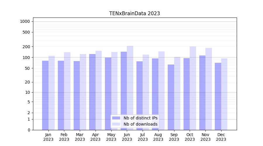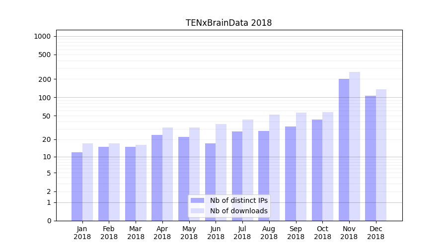 Number of downloads for experiment package TENxBrainData, year by year, from 2025 back to 2014 (years with no downloads are omitted):