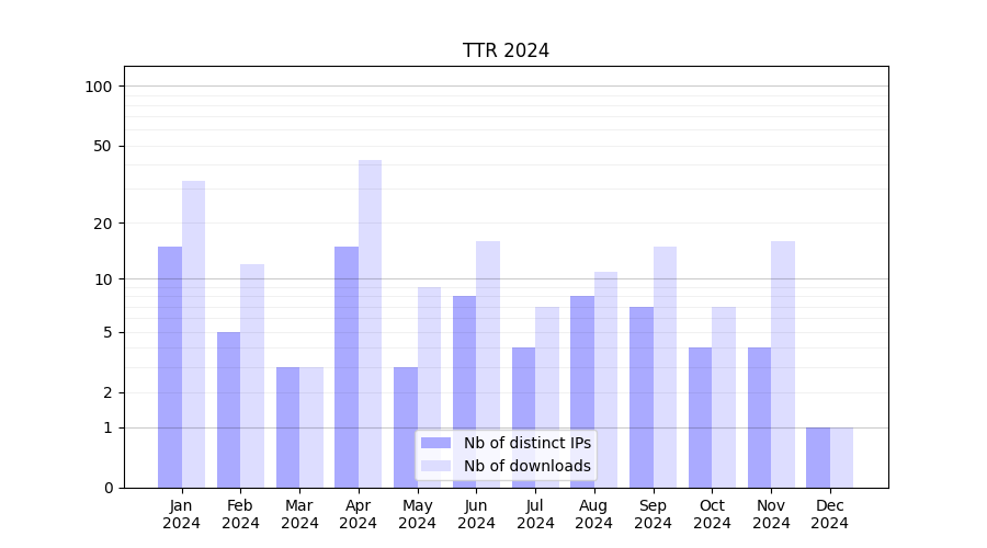 Number of downloads for experiment package TTR, year by year, from 2025 back to 2014 (years with no downloads are omitted):