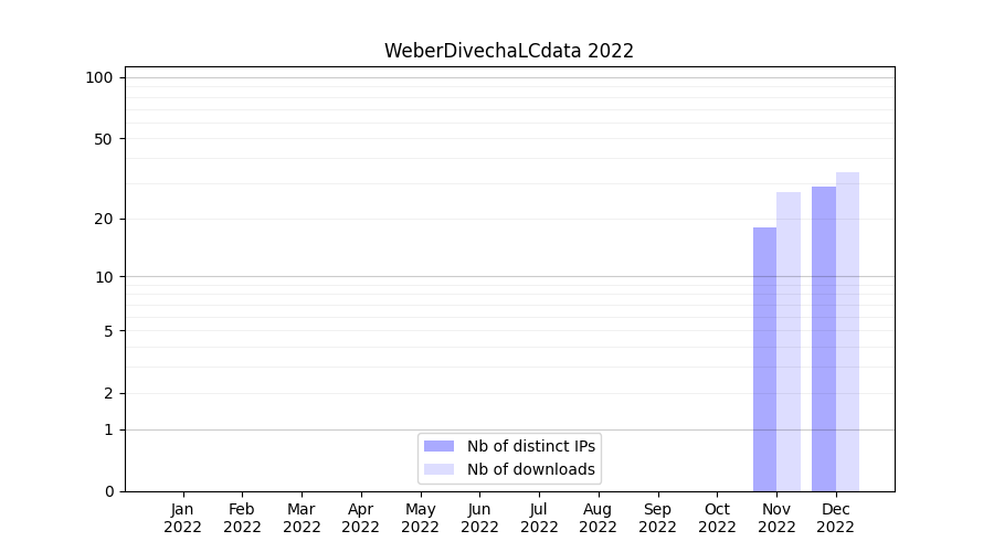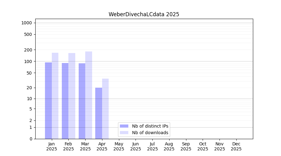 Number of downloads for experiment package WeberDivechaLCdata, year by year, from 2025 back to 2014 (years with no downloads are omitted):