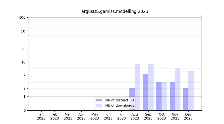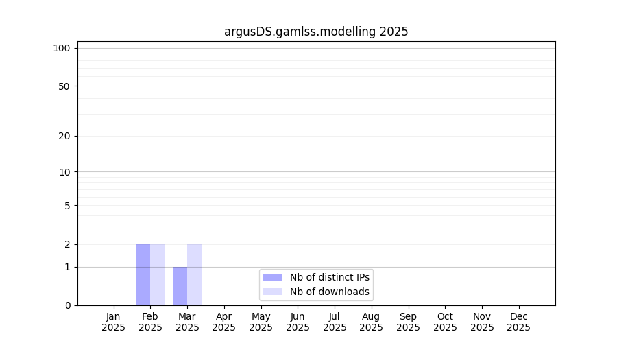 Number of downloads for experiment package argusDS.gamlss.modelling, year by year, from 2025 back to 2014 (years with no downloads are omitted):