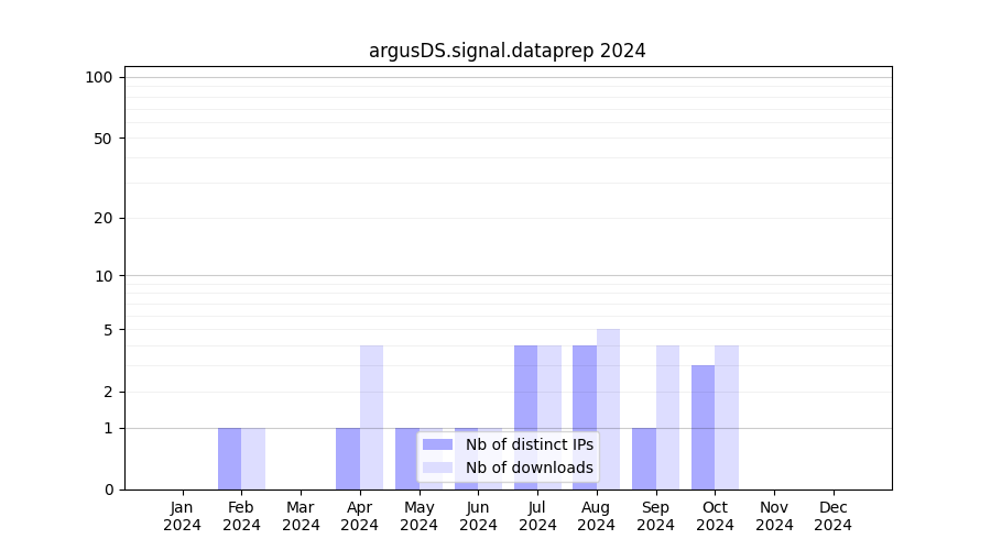 Number of downloads for experiment package argusDS.signal.dataprep, year by year, from 2025 back to 2014 (years with no downloads are omitted):