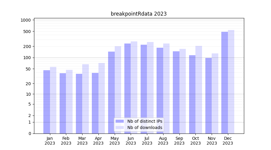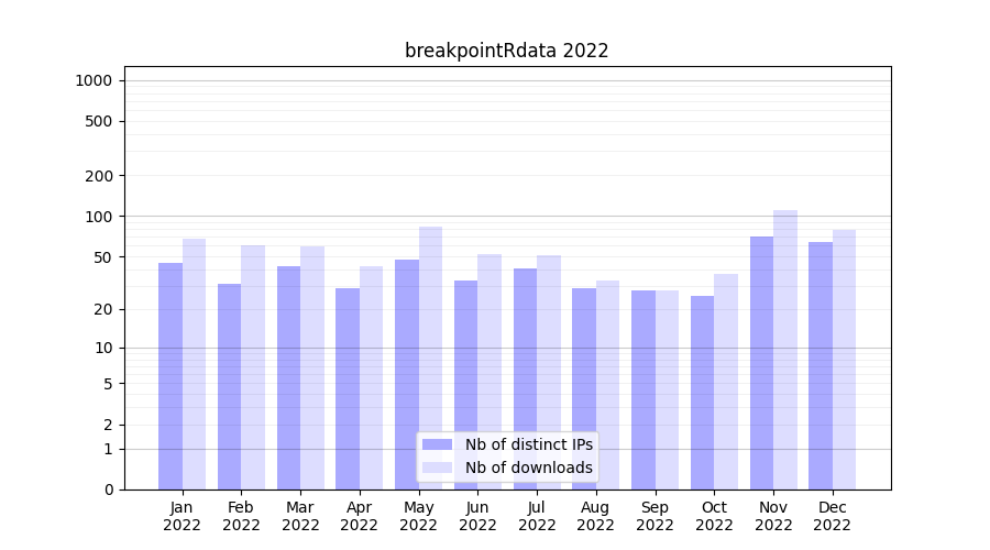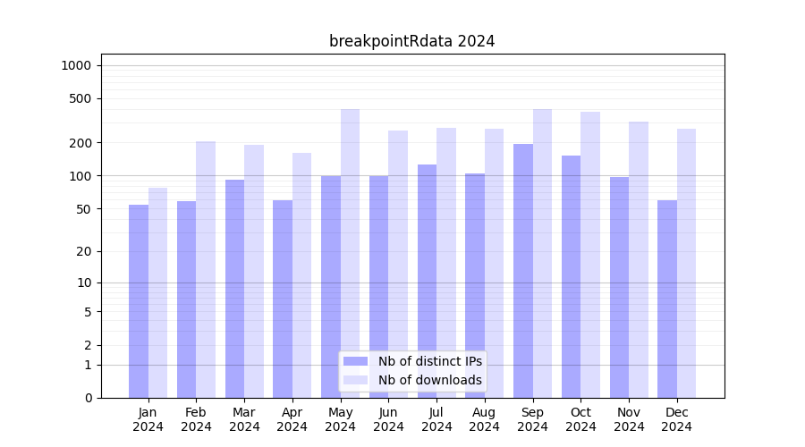 Number of downloads for experiment package breakpointRdata, year by year, from 2025 back to 2014 (years with no downloads are omitted):
