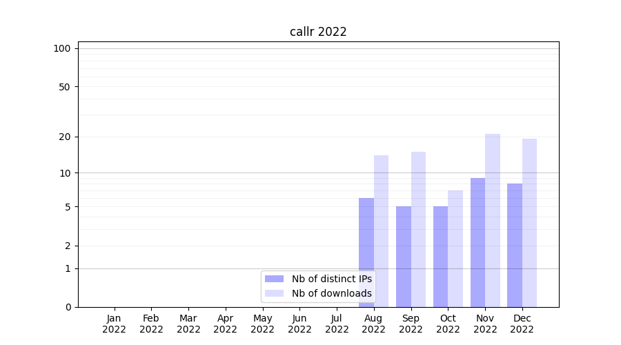 Number of downloads for experiment package callr, year by year, from 2025 back to 2014 (years with no downloads are omitted):