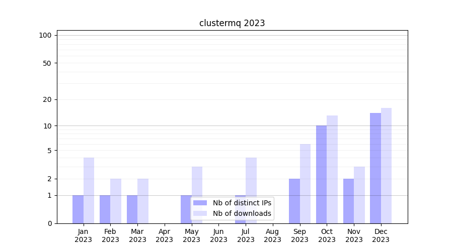 Number of downloads for experiment package clustermq, year by year, from 2025 back to 2014 (years with no downloads are omitted):