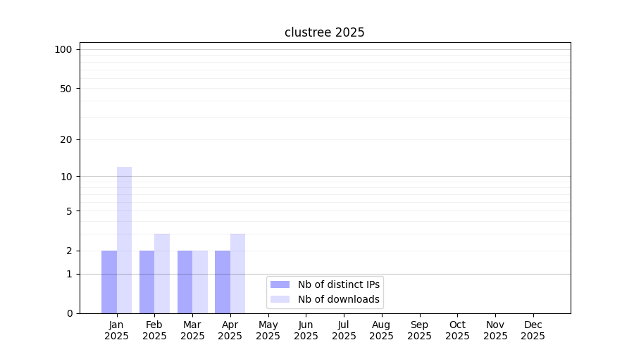 Number of downloads for experiment package clustree, year by year, from 2025 back to 2014 (years with no downloads are omitted):