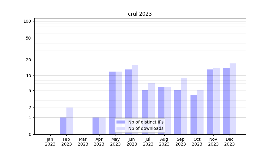 Number of downloads for experiment package crul, year by year, from 2025 back to 2014 (years with no downloads are omitted):