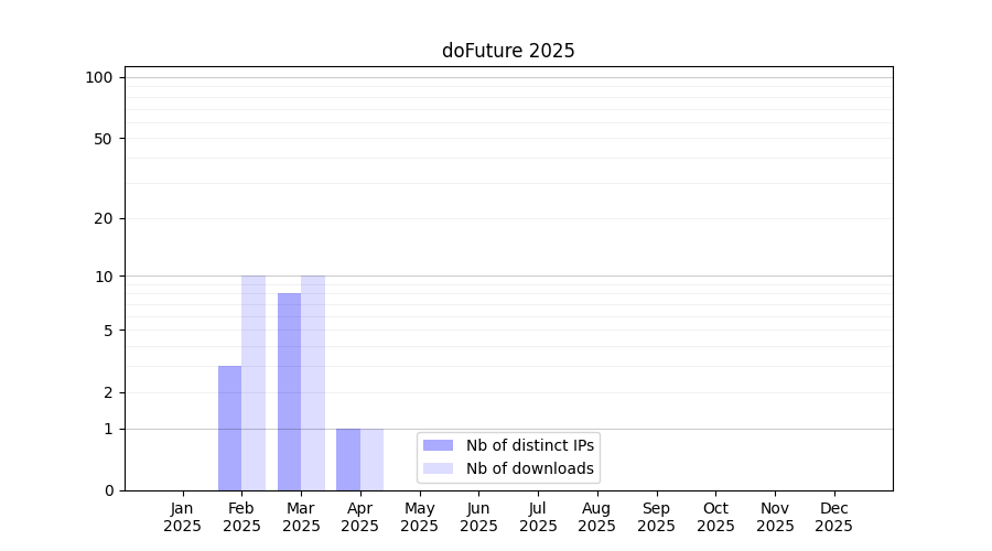 Number of downloads for experiment package doFuture, year by year, from 2025 back to 2014 (years with no downloads are omitted):