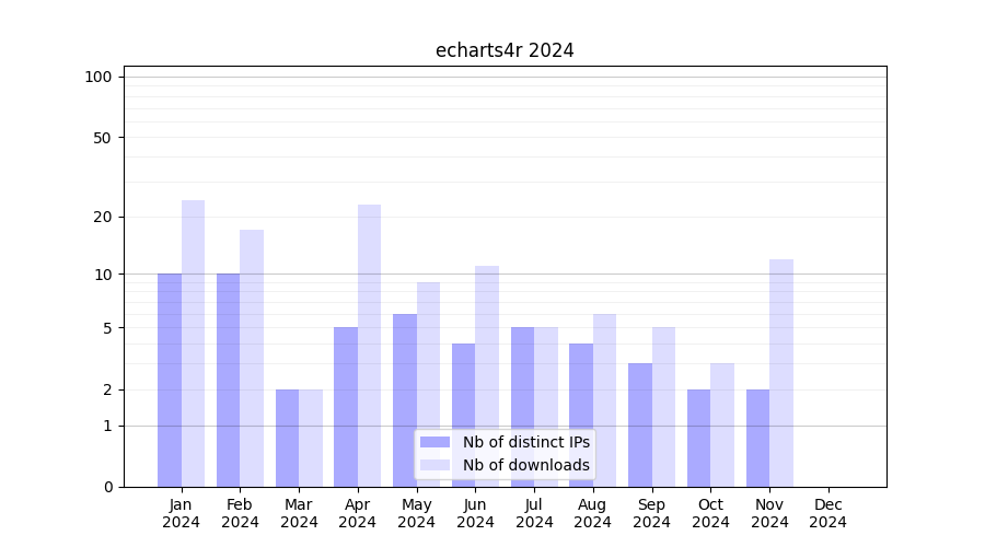 Number of downloads for experiment package echarts4r, year by year, from 2025 back to 2014 (years with no downloads are omitted):