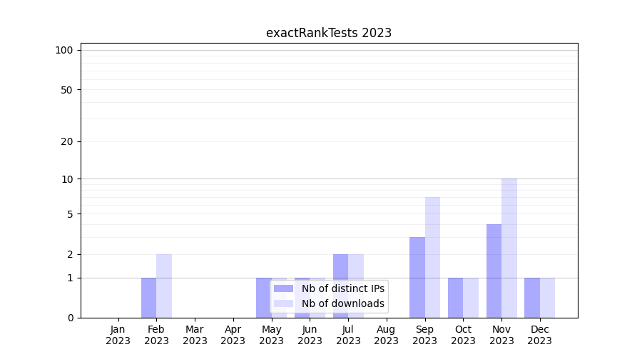 Number of downloads for experiment package exactRankTests, year by year, from 2025 back to 2014 (years with no downloads are omitted):