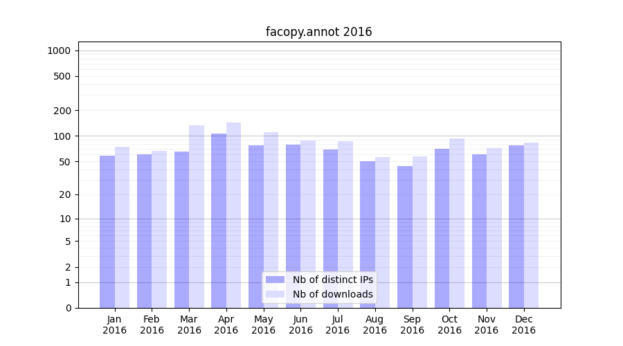 Number of downloads for experiment package facopy.annot, year by year, from 2025 back to 2014 (years with no downloads are omitted):