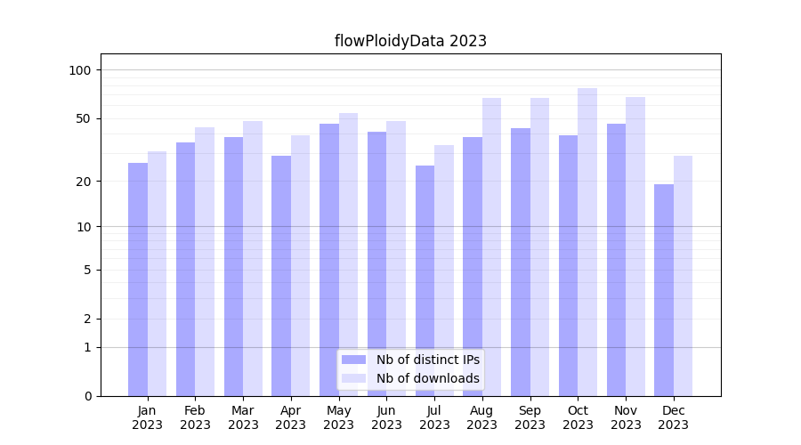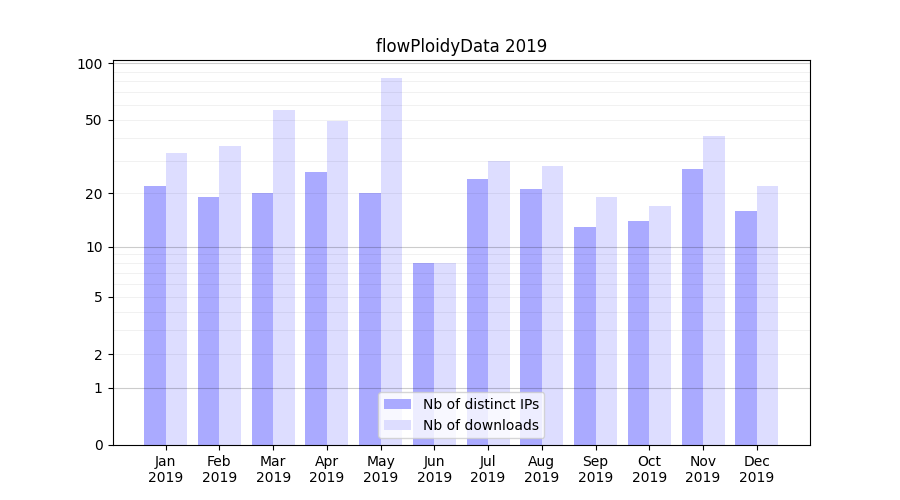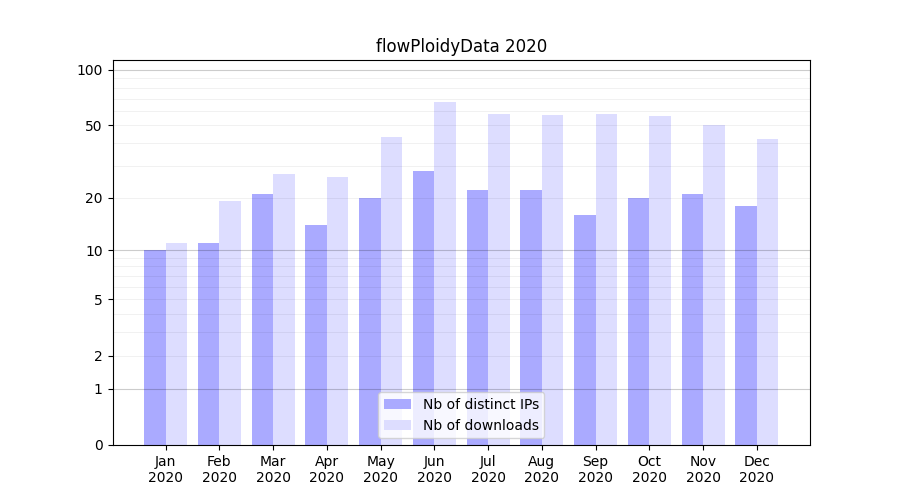 Number of downloads for experiment package flowPloidyData, year by year, from 2025 back to 2014 (years with no downloads are omitted):
