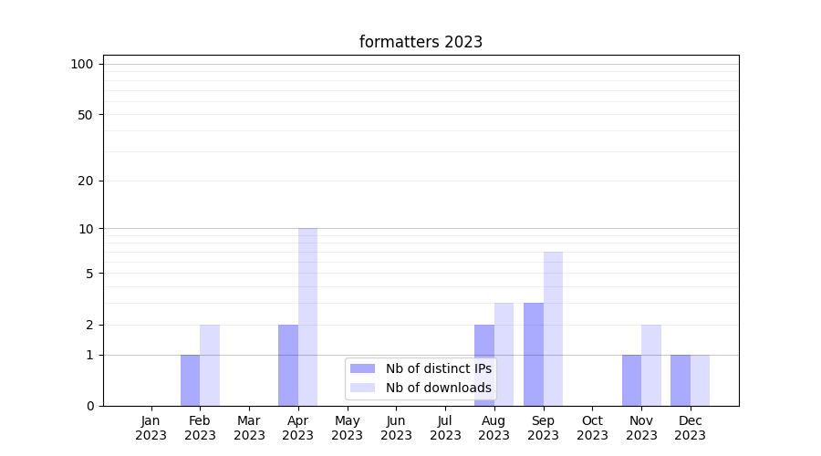 Number of downloads for experiment package formatters, year by year, from 2025 back to 2014 (years with no downloads are omitted):