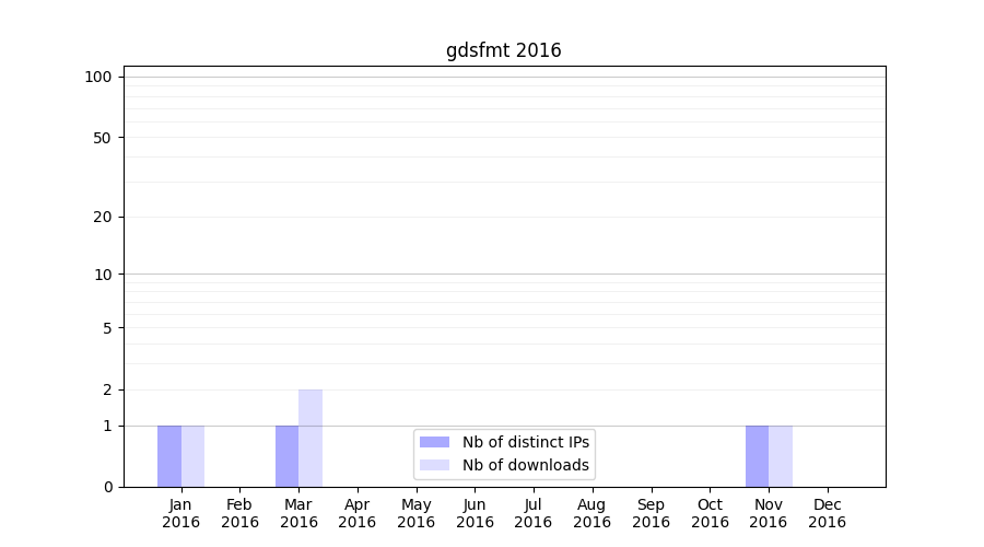 Number of downloads for experiment package gdsfmt, year by year, from 2025 back to 2014 (years with no downloads are omitted):