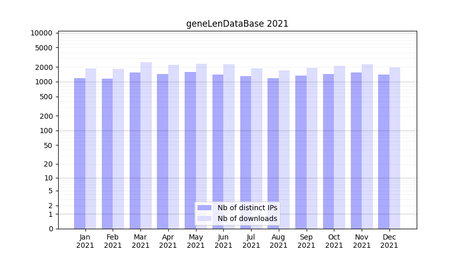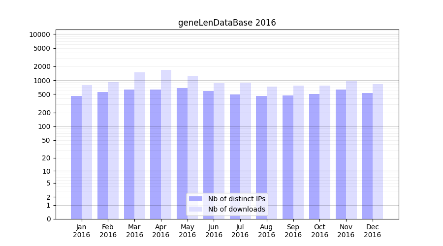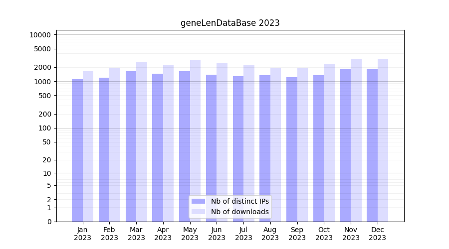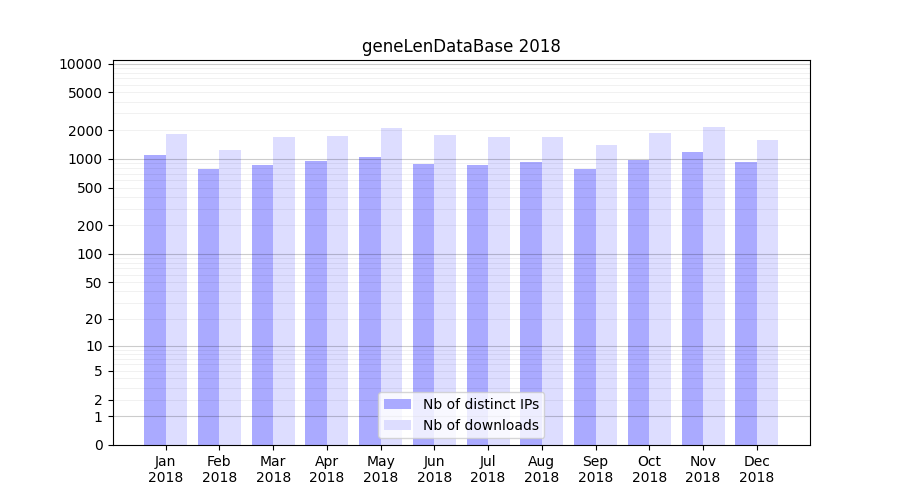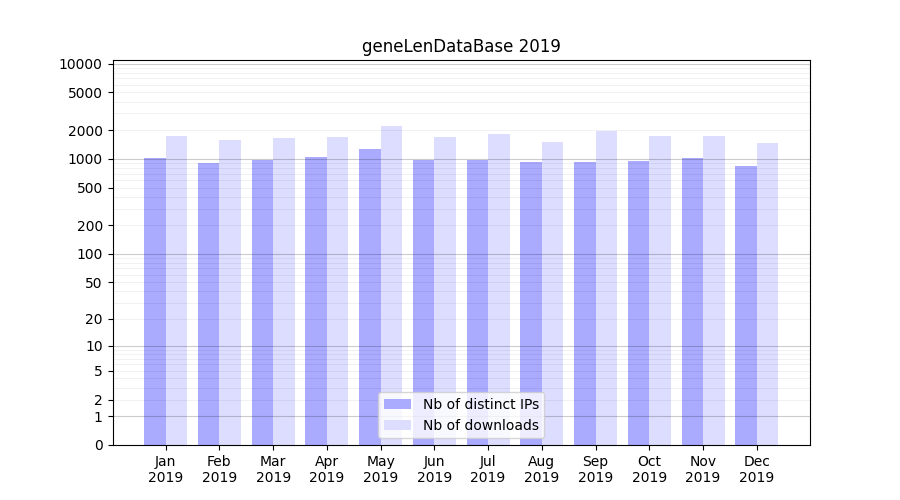 Number of downloads for experiment package geneLenDataBase, year by year, from 2025 back to 2014 (years with no downloads are omitted):