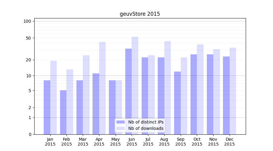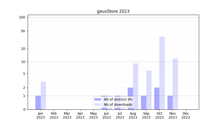 Number of downloads for experiment package geuvStore, year by year, from 2025 back to 2014 (years with no downloads are omitted):