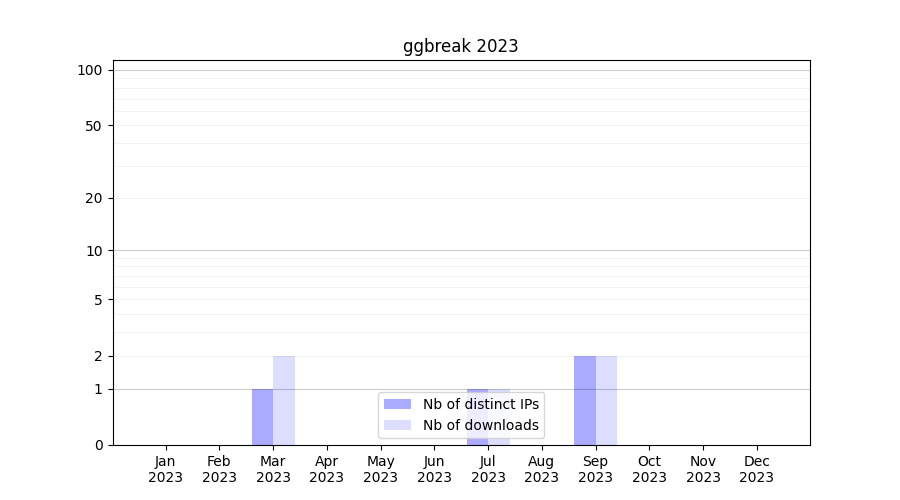Number of downloads for experiment package ggbreak, year by year, from 2025 back to 2014 (years with no downloads are omitted):