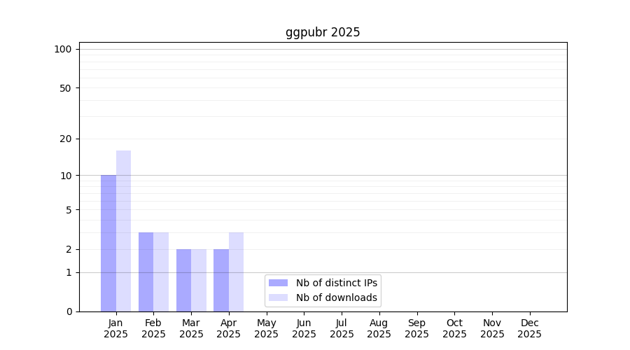 Number of downloads for experiment package ggpubr, year by year, from 2025 back to 2014 (years with no downloads are omitted):