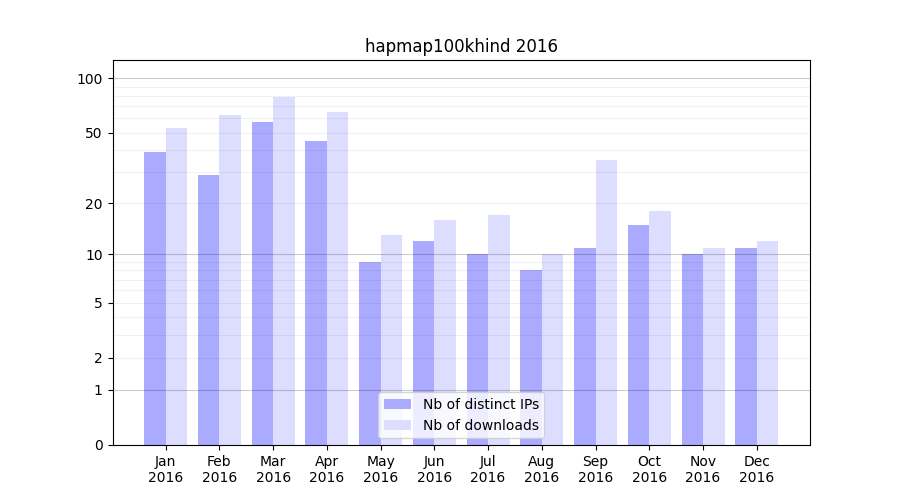 Number of downloads for experiment package hapmap100khind, year by year, from 2025 back to 2014 (years with no downloads are omitted):