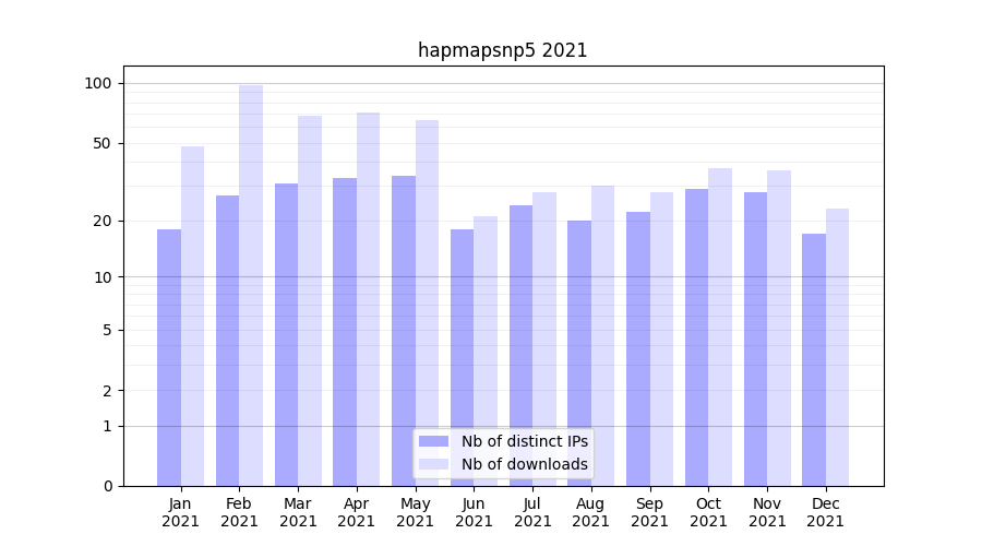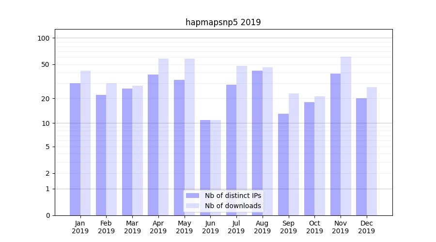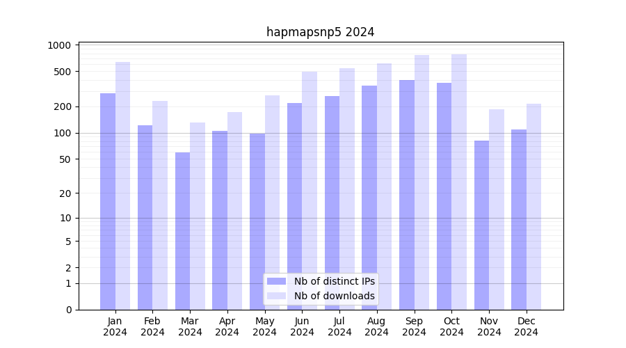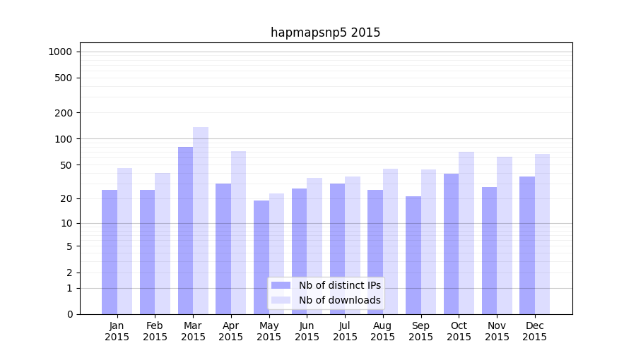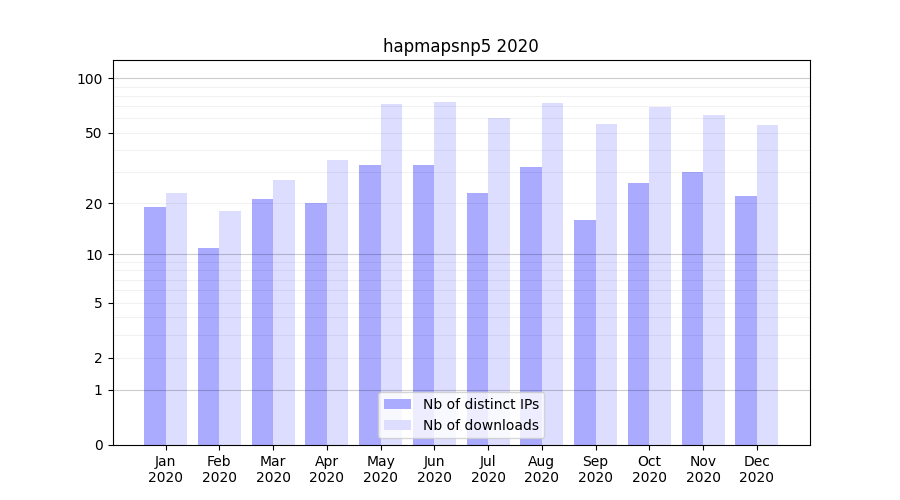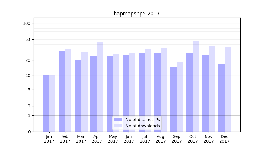 Number of downloads for experiment package hapmapsnp5, year by year, from 2025 back to 2014 (years with no downloads are omitted):