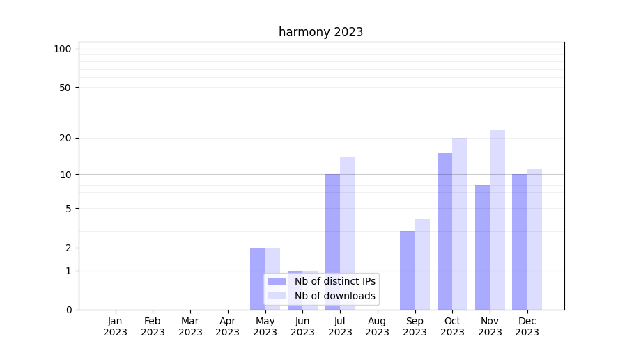 Number of downloads for experiment package harmony, year by year, from 2025 back to 2014 (years with no downloads are omitted):