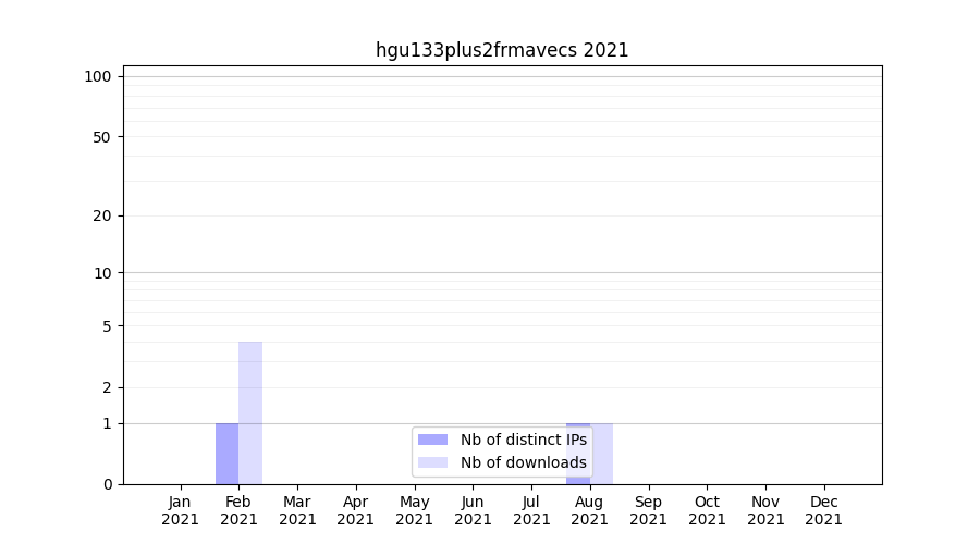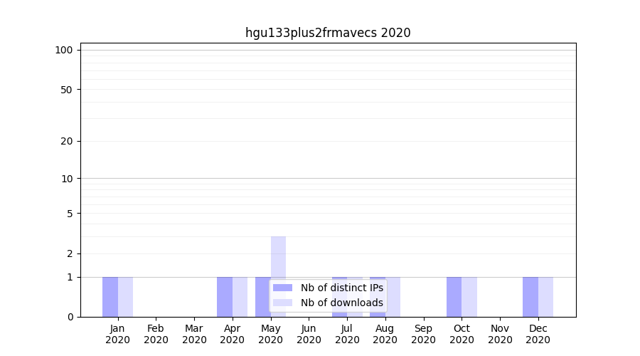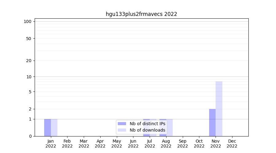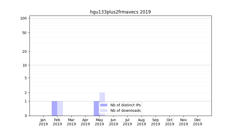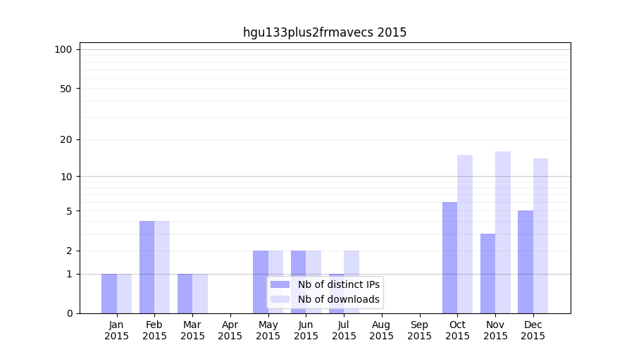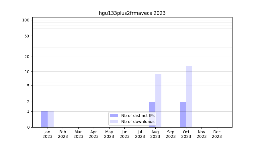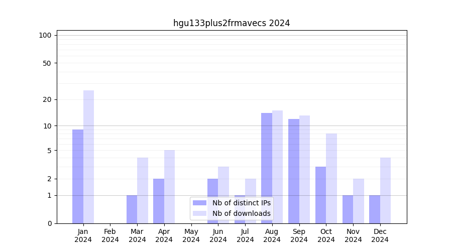 Number of downloads for experiment package hgu133plus2frmavecs, year by year, from 2025 back to 2014 (years with no downloads are omitted):