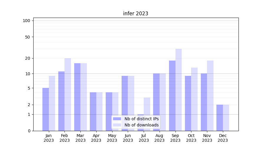 Number of downloads for experiment package infer, year by year, from 2025 back to 2014 (years with no downloads are omitted):