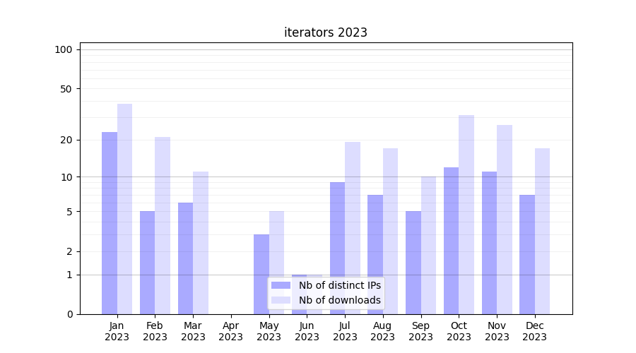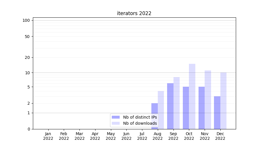 Number of downloads for experiment package iterators, year by year, from 2025 back to 2014 (years with no downloads are omitted):
