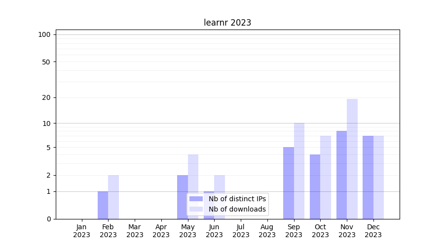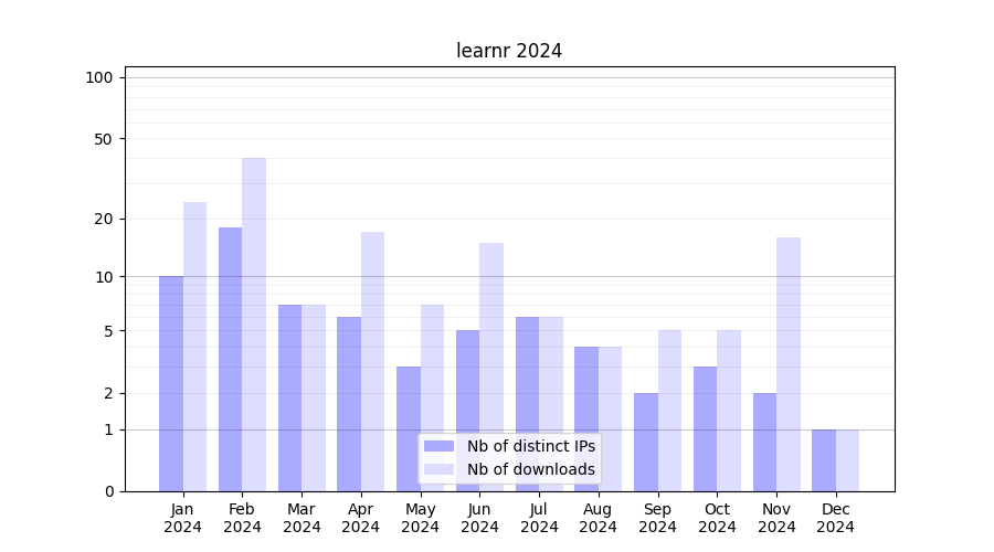 Number of downloads for experiment package learnr, year by year, from 2025 back to 2014 (years with no downloads are omitted):