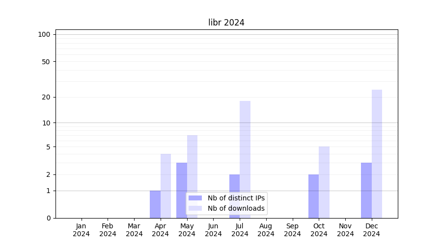 Number of downloads for experiment package libr, year by year, from 2025 back to 2014 (years with no downloads are omitted):