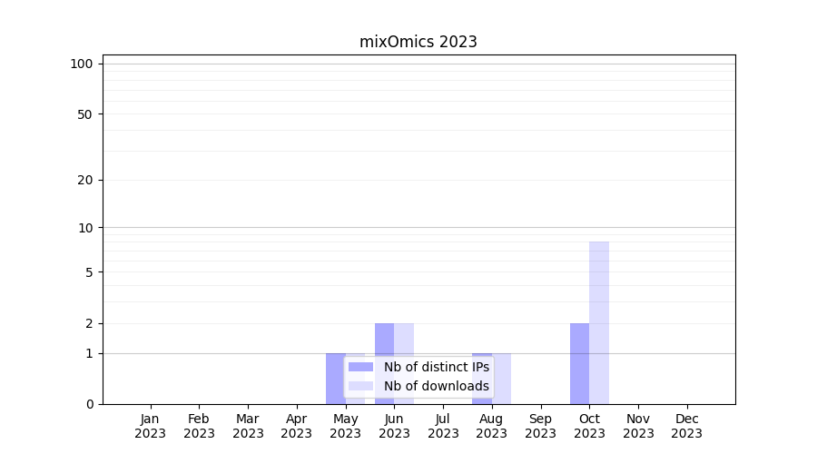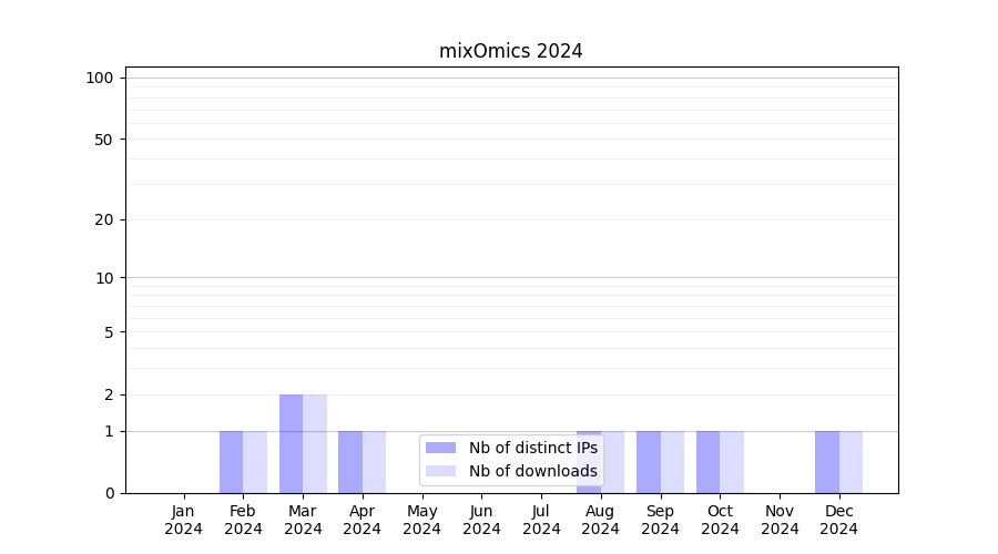 Number of downloads for experiment package mixOmics, year by year, from 2025 back to 2014 (years with no downloads are omitted):
