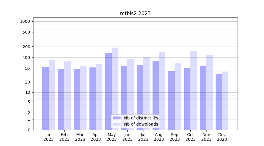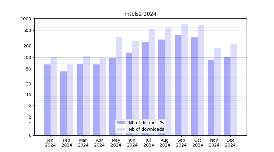 Number of downloads for experiment package mtbls2, year by year, from 2025 back to 2014 (years with no downloads are omitted):