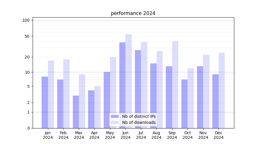 Number of downloads for experiment package performance, year by year, from 2025 back to 2014 (years with no downloads are omitted):