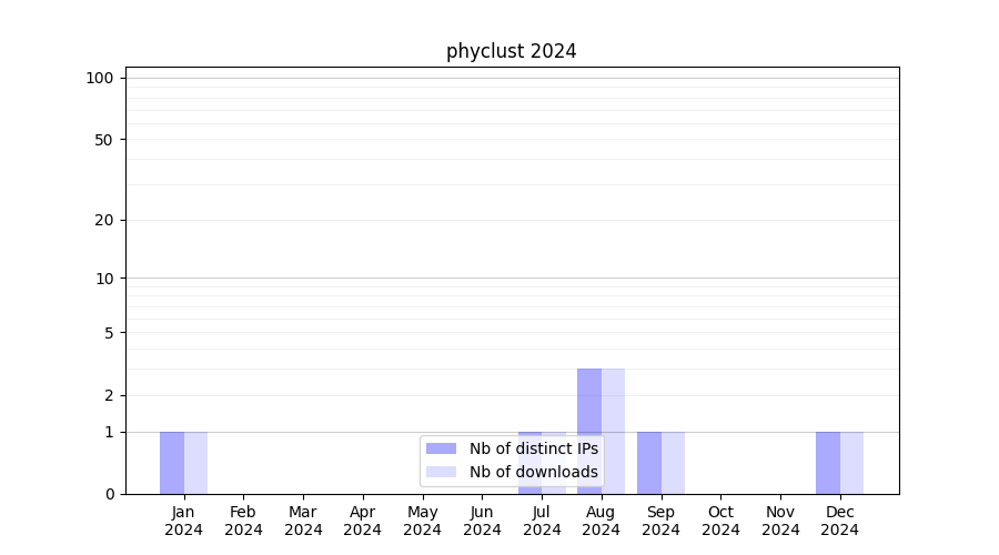 Number of downloads for experiment package phyclust, year by year, from 2025 back to 2014 (years with no downloads are omitted):