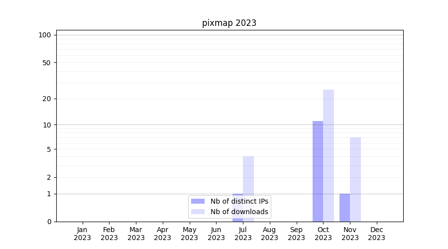 Number of downloads for experiment package pixmap, year by year, from 2025 back to 2014 (years with no downloads are omitted):
