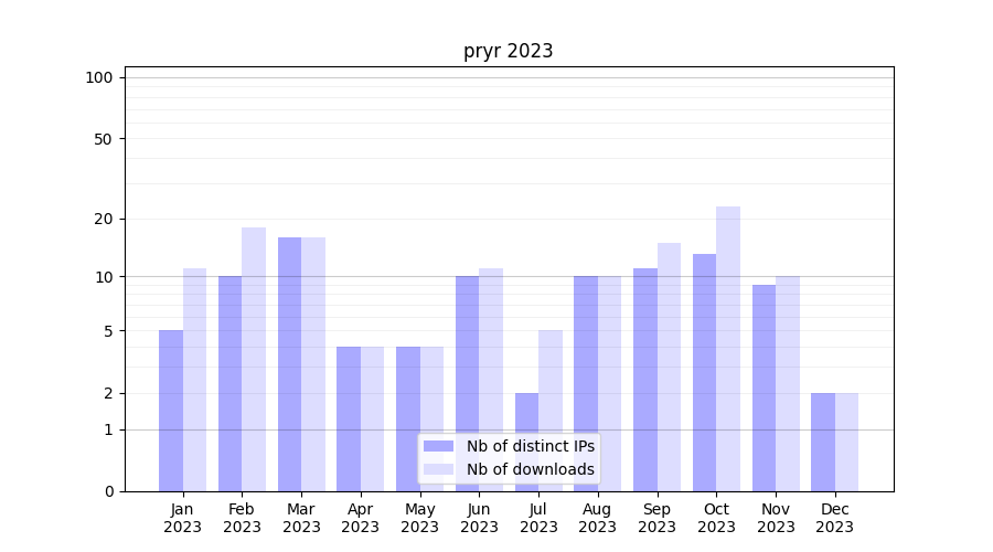 Number of downloads for experiment package pryr, year by year, from 2025 back to 2014 (years with no downloads are omitted):