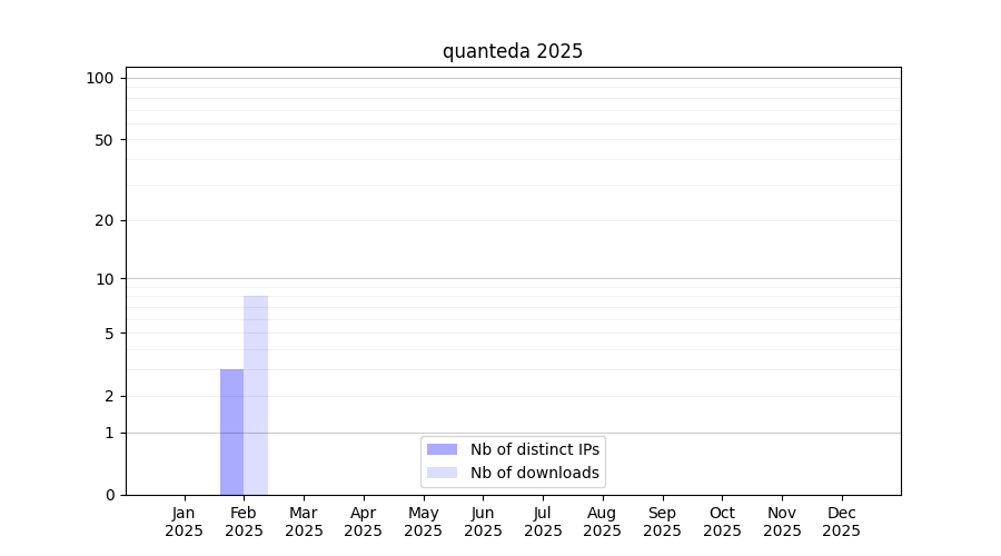 Number of downloads for experiment package quanteda, year by year, from 2025 back to 2014 (years with no downloads are omitted):