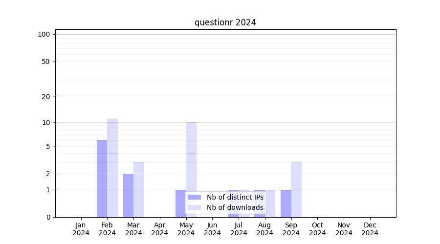 Number of downloads for experiment package questionr, year by year, from 2025 back to 2014 (years with no downloads are omitted):