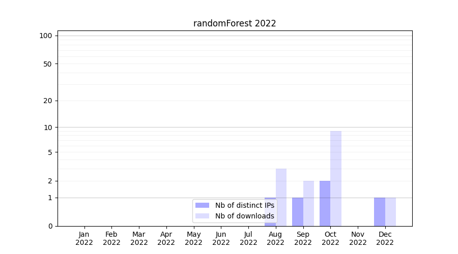 Number of downloads for experiment package randomForest, year by year, from 2025 back to 2014 (years with no downloads are omitted):