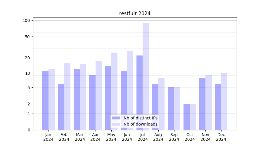 Number of downloads for experiment package restfulr, year by year, from 2025 back to 2014 (years with no downloads are omitted):